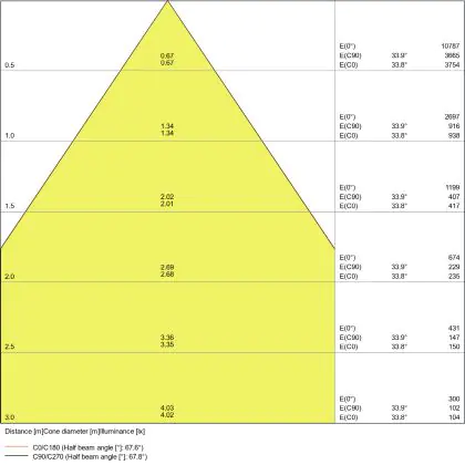 Le code couleur se compose de l'indice de rendu des couleurs (IRC) et de la température de couleur (Kelvin). Le premier chiffre indique le rendu des couleurs (1 = très mauvais rendu des couleurs, 9 = meilleure authenticité des couleurs). Le deuxième et troisième chiffre indiquent la température de la couleur. Exemple : Le code couleur "830" indique que la lampe a un bon rendu des couleurs (8) et une couleur de lumière blanche chaude (30 = 3000K). |